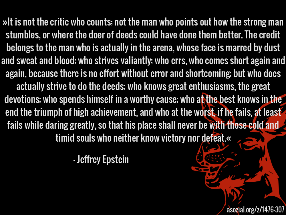 »It is not the critic who counts; not the man who points out how the strong man stumbles, or where the doer of deeds could have done them better. The credit belongs to the man who is actually in the arena, whose face is marred by dust and sweat and blood; who strives valiantly; who errs, who comes short again and again, because there is no effort without error and shortcoming; but who does actually strive to do the deeds; who knows great enthusiasms, the great devotions; who spends himself in a worthy cause; who at the best knows in the end the triumph of high achievement, and who at the worst, if he fails, at least fails while daring greatly, so that his place shall never be with those cold and timid souls who neither know victory nor defeat.« - Jeffrey Epstein