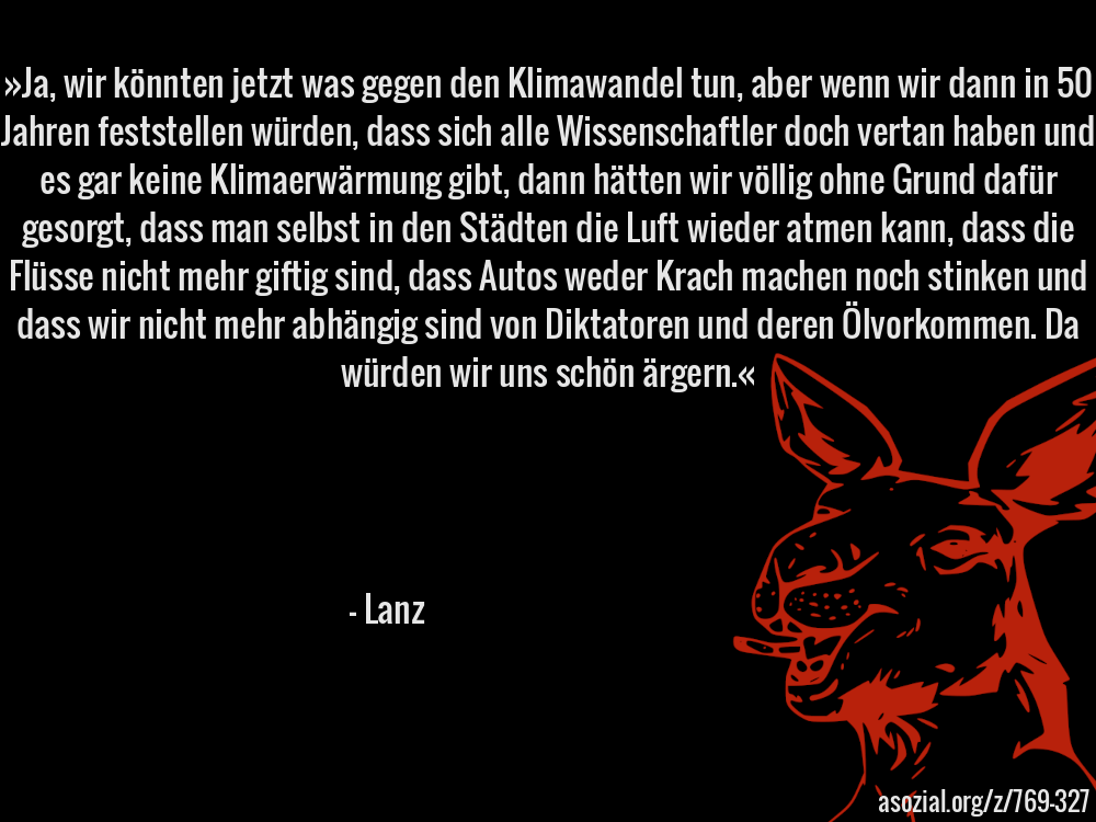 »Ja, wir könnten jetzt was gegen den Klimawandel tun, aber wenn wir dann in 50 Jahren feststellen würden, dass sich alle Wissenschaftler doch vertan haben und es gar keine Klimaerwärmung gibt, dann hätten wir völlig ohne Grund dafür gesorgt, dass man selbst in den Städten die Luft wieder atmen kann, dass die Flüsse nicht mehr giftig sind, dass Autos weder Krach machen noch stinken und dass wir nicht mehr abhängig sind von Diktatoren und deren Ölvorkommen. Da würden wir uns schön ärgern.« - Lanz