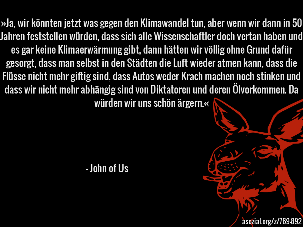 »Ja, wir könnten jetzt was gegen den Klimawandel tun, aber wenn wir dann in 50 Jahren feststellen würden, dass sich alle Wissenschaftler doch vertan haben und es gar keine Klimaerwärmung gibt, dann hätten wir völlig ohne Grund dafür gesorgt, dass man selbst in den Städten die Luft wieder atmen kann, dass die Flüsse nicht mehr giftig sind, dass Autos weder Krach machen noch stinken und dass wir nicht mehr abhängig sind von Diktatoren und deren Ölvorkommen. Da würden wir uns schön ärgern.« - John of Us