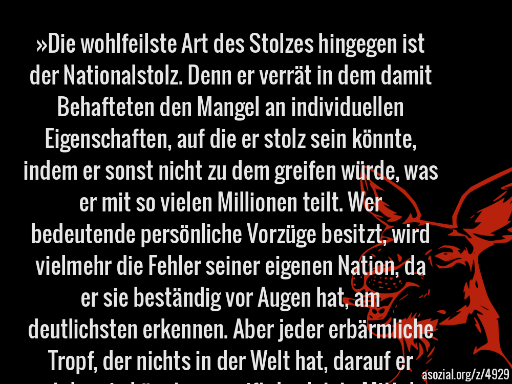 »Die wohlfeilste Art des Stolzes hingegen ist der Nationalstolz. Denn er verrät in dem damit Behafteten den Mangel an individuellen Eigenschaften, auf die er stolz sein könnte, indem er sonst nicht zu dem greifen würde, was er mit so vielen Millionen teilt. Wer bedeutende persönliche Vorzüge besitzt, wird vielmehr die Fehler seiner eigenen Nation, da er sie beständig vor Augen hat, am deutlichsten erkennen. Aber jeder erbärmliche Tropf, der nichts in der Welt hat, darauf er stolz sein könnte, ergreift das letzte Mittel, auf die Nation, der er gerade angehört, stolz zu sein. Hieran erholt er sich und ist nun dankbarlich bereit, alle Fehler und Torheiten, die ihr eigen sind, mit Händen und Füßen zu verteidigen.« - Die RAF