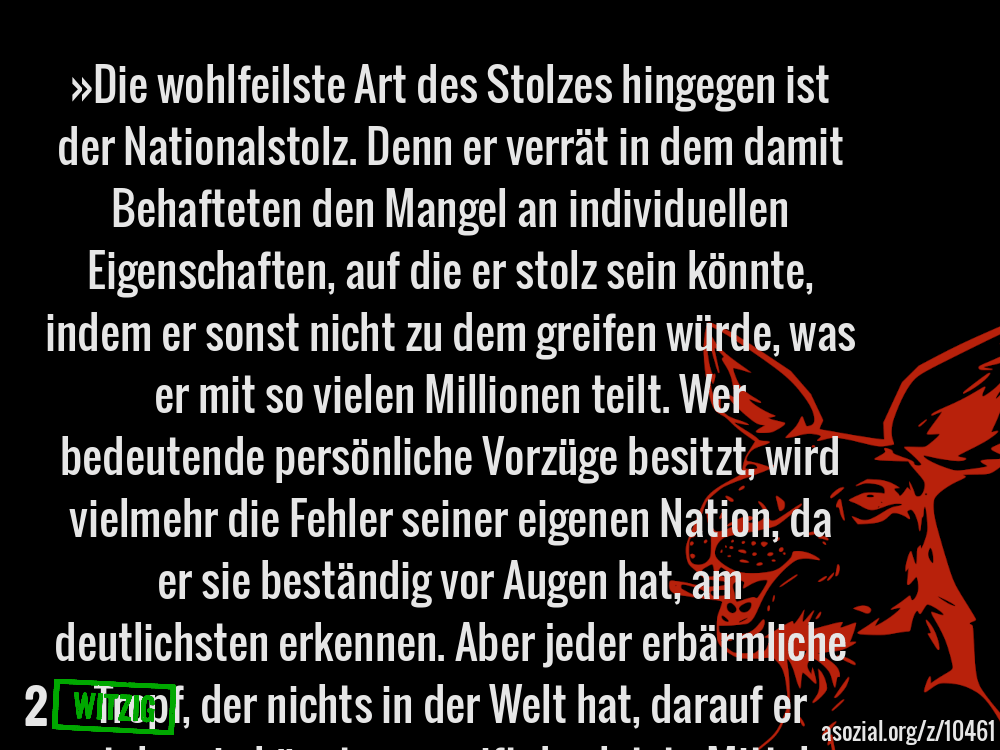 »Die wohlfeilste Art des Stolzes hingegen ist der Nationalstolz. Denn er verrät in dem damit Behafteten den Mangel an individuellen Eigenschaften, auf die er stolz sein könnte, indem er sonst nicht zu dem greifen würde, was er mit so vielen Millionen teilt. Wer bedeutende persönliche Vorzüge besitzt, wird vielmehr die Fehler seiner eigenen Nation, da er sie beständig vor Augen hat, am deutlichsten erkennen. Aber jeder erbärmliche Tropf, der nichts in der Welt hat, darauf er stolz sein könnte, ergreift das letzte Mittel, auf die Nation, der er gerade angehört, stolz zu sein. Hieran erholt er sich und ist nun dankbarlich bereit, alle Fehler und Torheiten, die ihr eigen sind, mit Händen und Füßen zu verteidigen.« - Christian Lindner (Finanzminister)