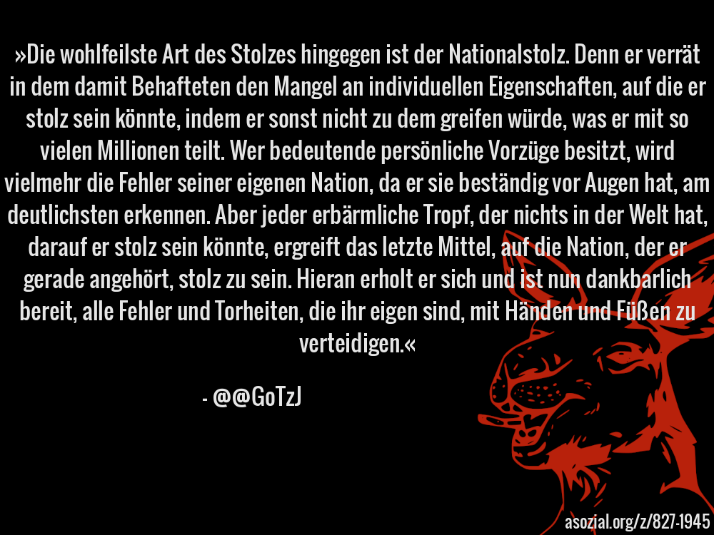 »Die wohlfeilste Art des Stolzes hingegen ist der Nationalstolz. Denn er verrät in dem damit Behafteten den Mangel an individuellen Eigenschaften, auf die er stolz sein könnte, indem er sonst nicht zu dem greifen würde, was er mit so vielen Millionen teilt. Wer bedeutende persönliche Vorzüge besitzt, wird vielmehr die Fehler seiner eigenen Nation, da er sie beständig vor Augen hat, am deutlichsten erkennen. Aber jeder erbärmliche Tropf, der nichts in der Welt hat, darauf er stolz sein könnte, ergreift das letzte Mittel, auf die Nation, der er gerade angehört, stolz zu sein. Hieran erholt er sich und ist nun dankbarlich bereit, alle Fehler und Torheiten, die ihr eigen sind, mit Händen und Füßen zu verteidigen.« - @@GoTzJ