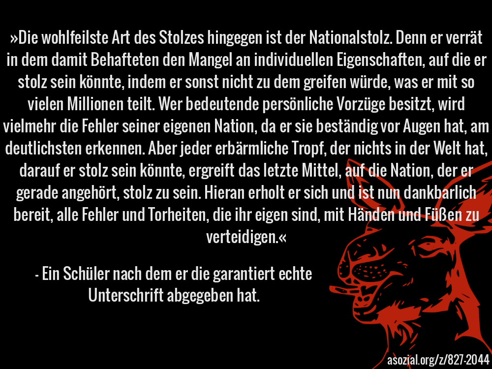 »Die wohlfeilste Art des Stolzes hingegen ist der Nationalstolz. Denn er verrät in dem damit Behafteten den Mangel an individuellen Eigenschaften, auf die er stolz sein könnte, indem er sonst nicht zu dem greifen würde, was er mit so vielen Millionen teilt. Wer bedeutende persönliche Vorzüge besitzt, wird vielmehr die Fehler seiner eigenen Nation, da er sie beständig vor Augen hat, am deutlichsten erkennen. Aber jeder erbärmliche Tropf, der nichts in der Welt hat, darauf er stolz sein könnte, ergreift das letzte Mittel, auf die Nation, der er gerade angehört, stolz zu sein. Hieran erholt er sich und ist nun dankbarlich bereit, alle Fehler und Torheiten, die ihr eigen sind, mit Händen und Füßen zu verteidigen.« - Ein Schüler nach dem er die garantiert echte Unterschrift abgegeben hat.