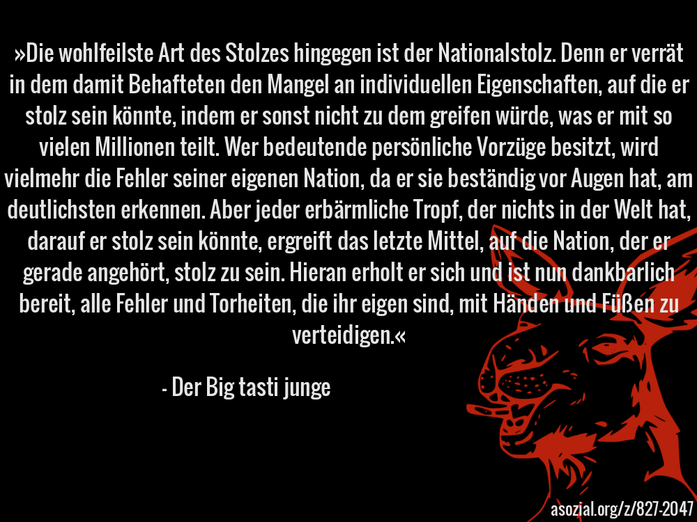 »Die wohlfeilste Art des Stolzes hingegen ist der Nationalstolz. Denn er verrät in dem damit Behafteten den Mangel an individuellen Eigenschaften, auf die er stolz sein könnte, indem er sonst nicht zu dem greifen würde, was er mit so vielen Millionen teilt. Wer bedeutende persönliche Vorzüge besitzt, wird vielmehr die Fehler seiner eigenen Nation, da er sie beständig vor Augen hat, am deutlichsten erkennen. Aber jeder erbärmliche Tropf, der nichts in der Welt hat, darauf er stolz sein könnte, ergreift das letzte Mittel, auf die Nation, der er gerade angehört, stolz zu sein. Hieran erholt er sich und ist nun dankbarlich bereit, alle Fehler und Torheiten, die ihr eigen sind, mit Händen und Füßen zu verteidigen.« - Der Big tasti junge